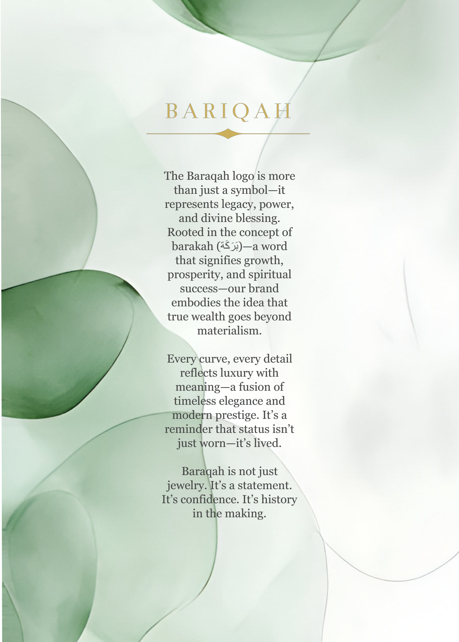 Baraqah isn’t just jewelry—it’s a statement. Inspired by tradition and prestige, each piece reflects elegance, confidence, and timeless wealth. Whether worn as a symbol of personal success or passed down as a legacy, our jewelry tells a story that lasts beyond a lifetime.